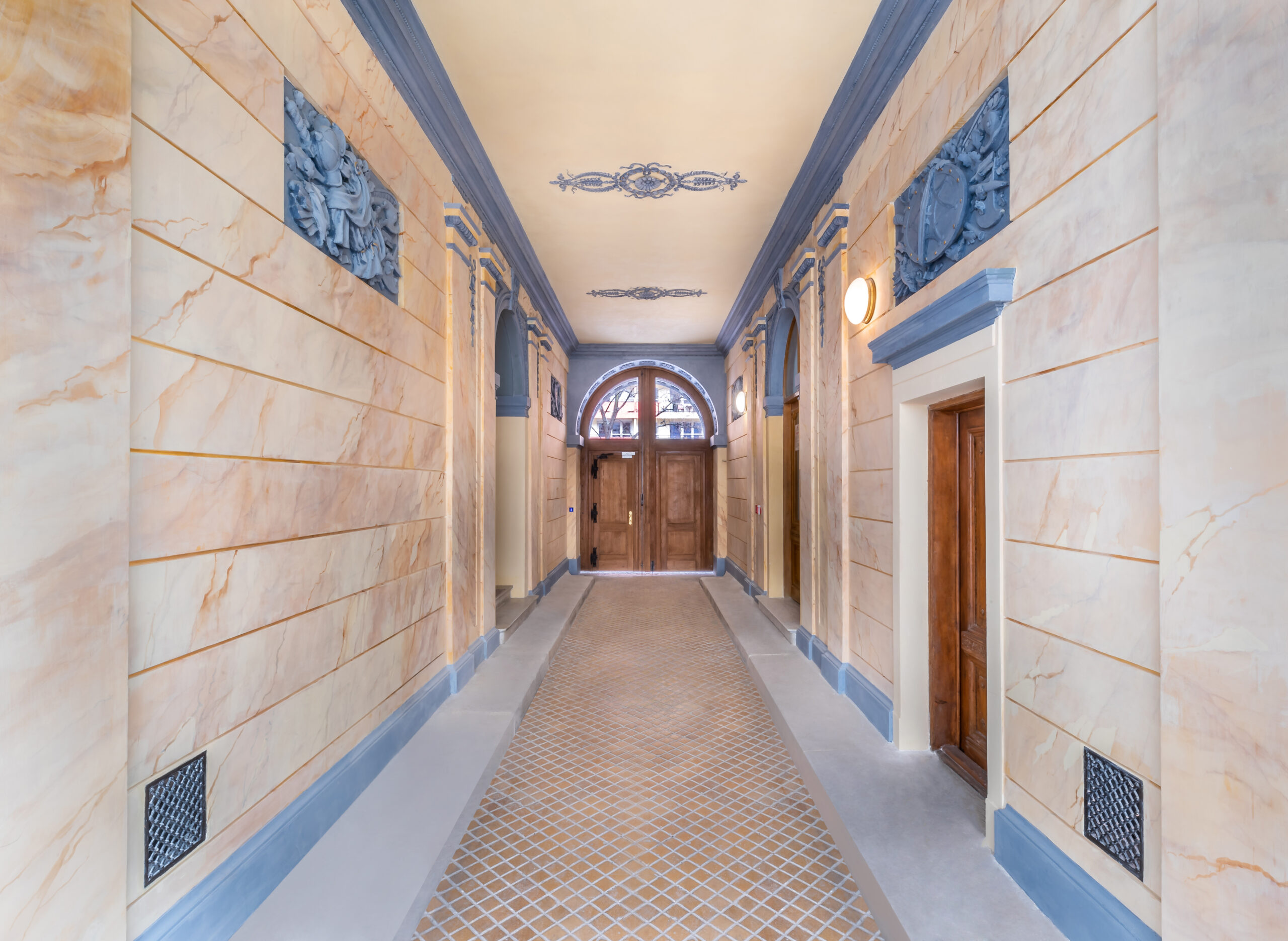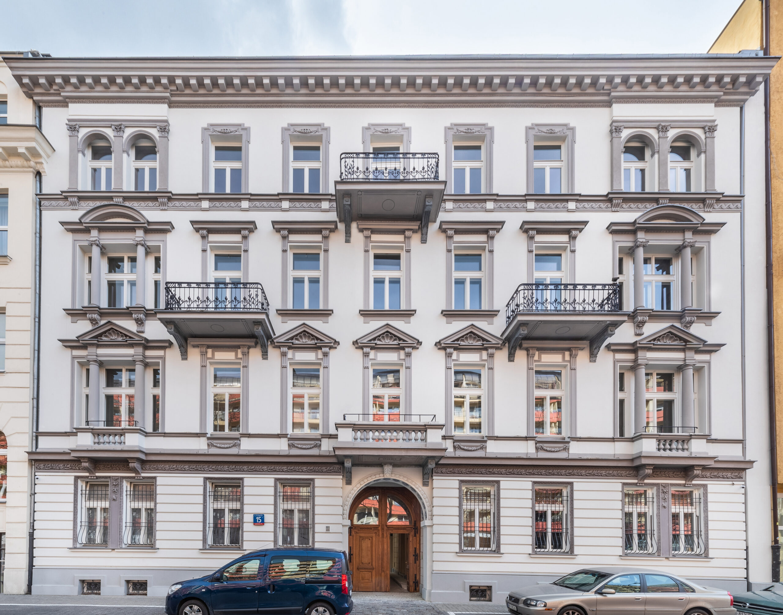 - odrestaurowana elewacja z pieczołowicie odnowionymi zdobnymi dekoracjami sztukatorskimi