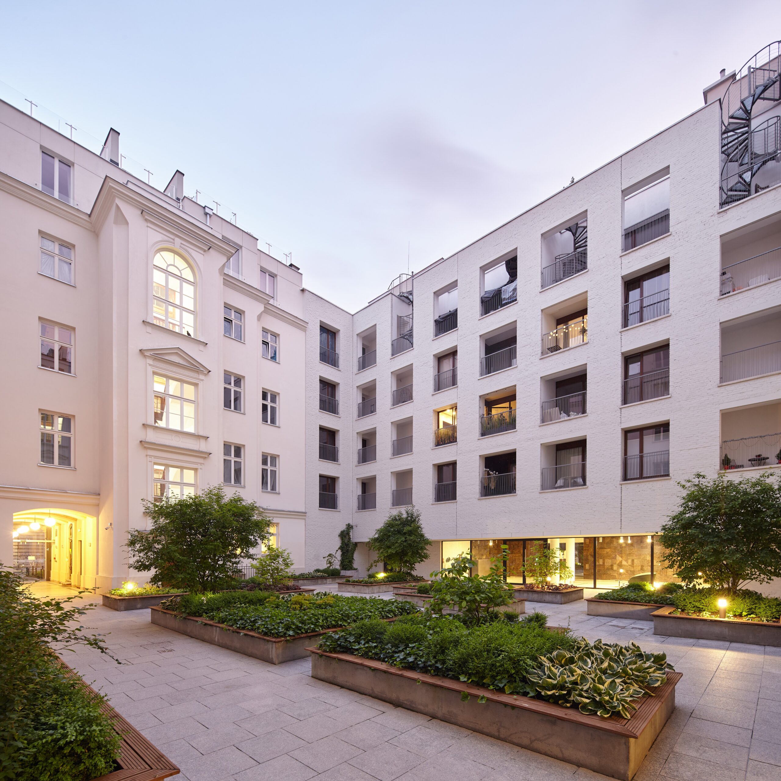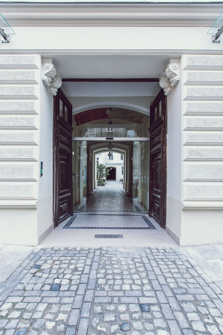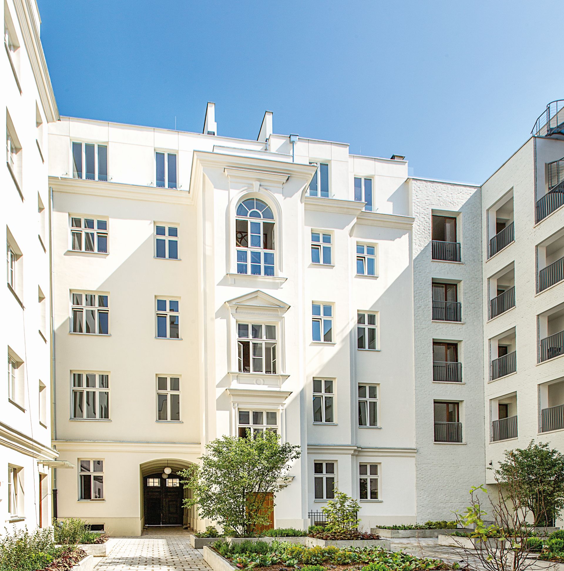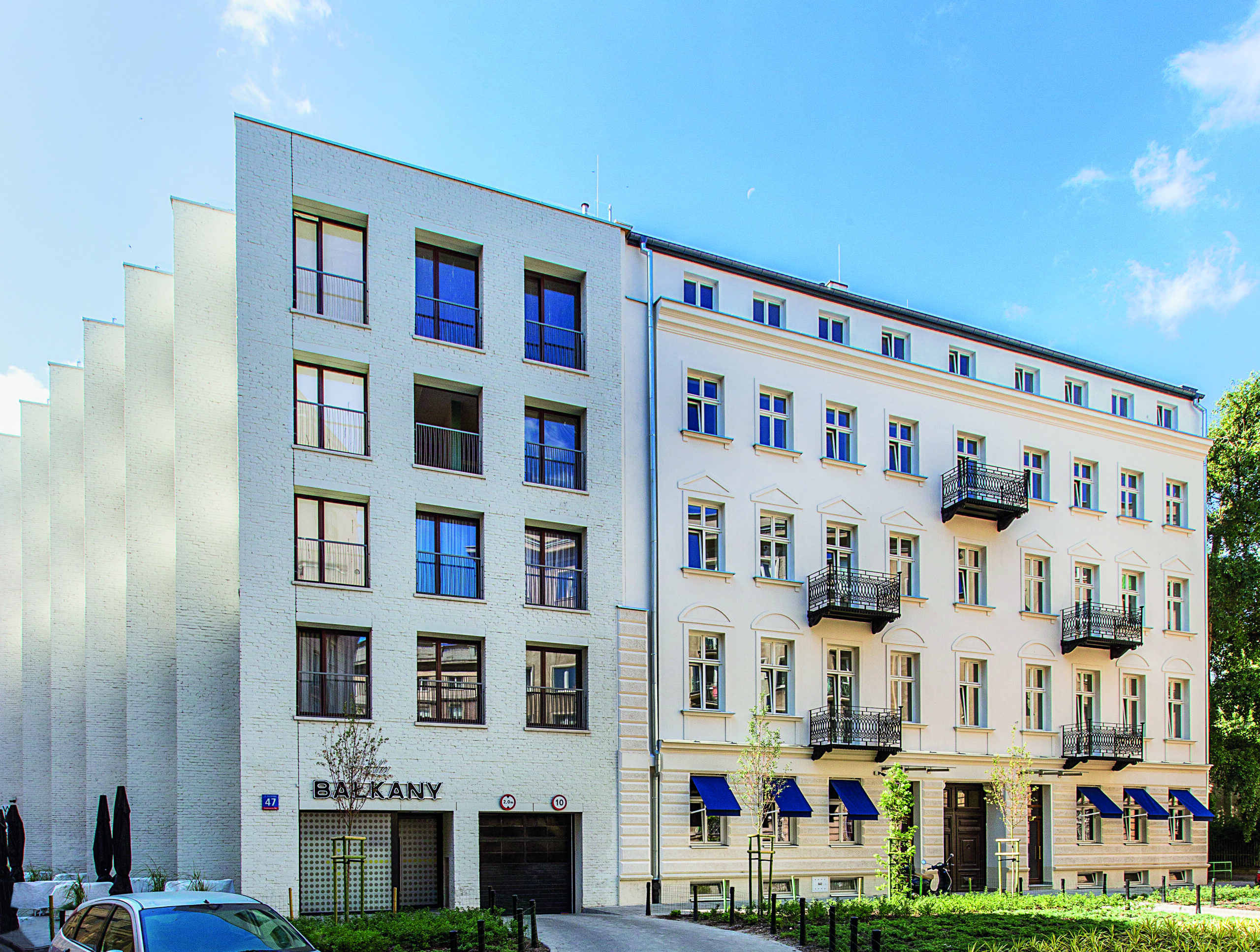 - nowoczesna kontynuacja kamienicy z modernistyczną elewacją wkomponowaną w zabytkową architekturę